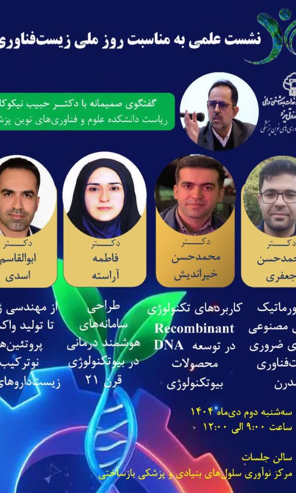 نشست علمی به مناسبت روز ملی زیستفناوریرابط سایت دانشکده علوم و فنون نوین7 دی 1404🧬 روز ملی زیستفناوری/۲۷ آذرماه مرکز نوآوری سلول های بنیادی و پزشکی بازساختی ... اطلاعات بیشتر